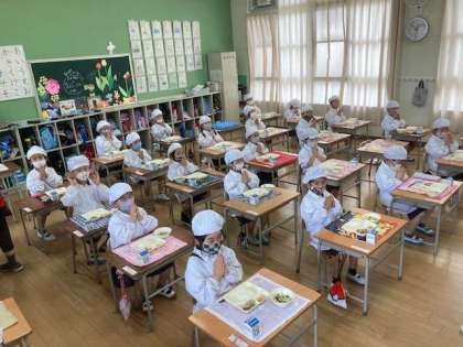 今日の献立は米飯・牛乳・豚肉の甘辛焼き・すまし汁・切り干し大根の炒め煮・アーモンドフィッシュでした。