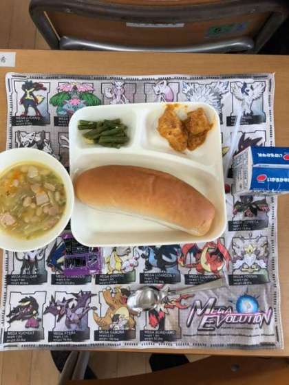 今日の献立は、コッペパン・ブルーベリージャム・牛乳・鶏肉のカレーマヨネーズ焼き・てぼ豆のスープ・さんどまめとコーンのサラダでした。