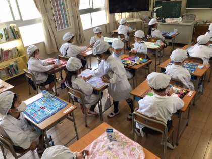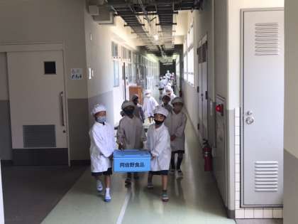 当番が給食室に給食を取りに行き、配膳も自分たちで行います。