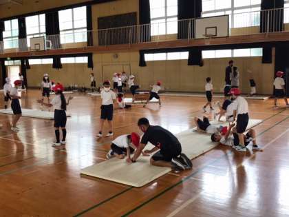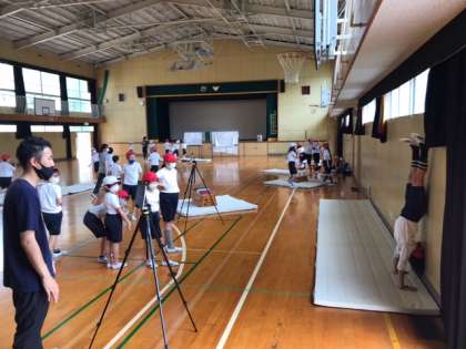 体育館では、4年生が中学校の体育科の先生にもマット運動を指導してもらいました。