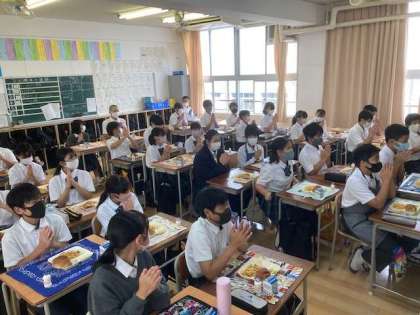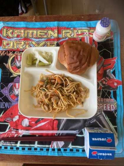 今日の献立は、黒糖パン・牛乳・チキントマトスパゲッティ・グリーンアスパラガスとキャベツのサラダ・発酵乳でした。