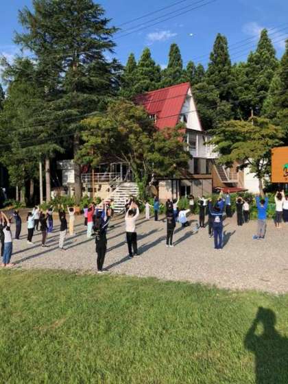朝のつどいで体操をし、軽く鬼ごっこで体を動かします。