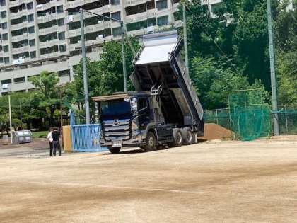 写真を見てもわかる通り、たくさんの山土が入ったので、少々グランドが傷んでも大丈夫です。たくさん走り回ってください。