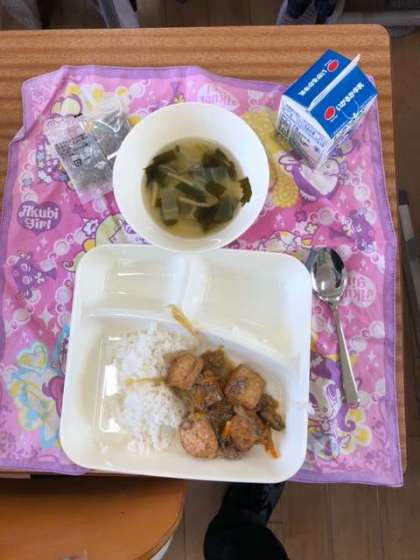 今日の献立は、マーボーあつあげ丼・中華スープ・ミニフィッシュ・牛乳でした。