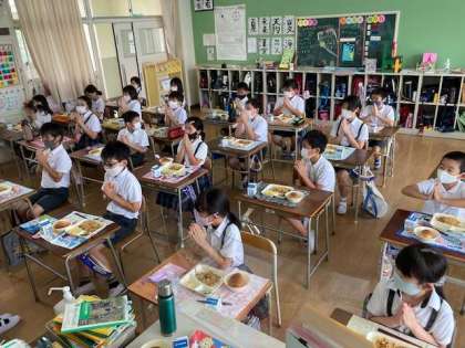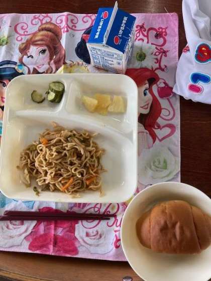 今日の献立は、黒糖パン・牛乳・焼きそば・きゅうりのしょうがづけ・洋なしでした。