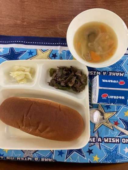 今日の献立は、こくとうパン・牛乳・牛肉の香味焼き・スープ煮・サワーキャベツでした。
