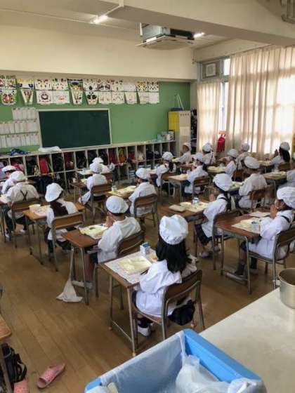 今日の献立は、ご飯・牛乳・さごしの塩焼き・豚肉とじゃがいもの煮もの・キャベツの梅風味です。