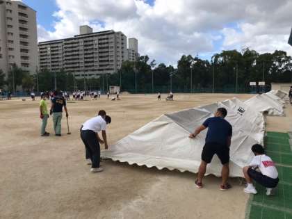 テント設営、トラックの整備、得点掲示板の設置など