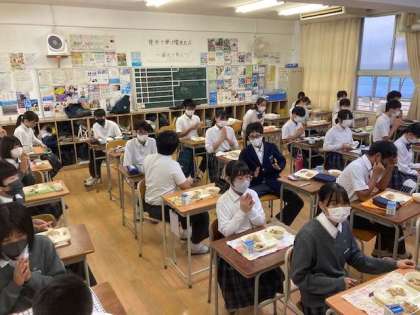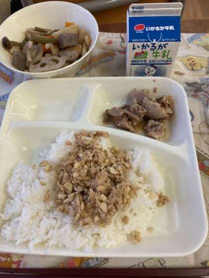 今日の献立は、ご飯・牛乳・豚肉のネギじょうゆ焼き・ふきよせ煮・ツナ大豆そぼろです。