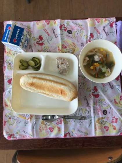 本日のメニューはコッペパン・アプリコットジャム・牛乳・かつおのマリネ焼き・鶏肉とじゃがいものスープ・きゅうりのサラダです。