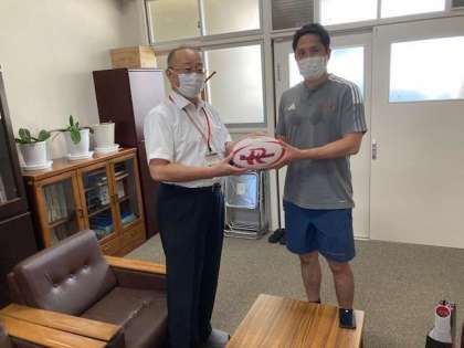 10月7日の午後、NTTドコモレッドハリケーンズ大阪からラグビーボールの寄付がありました。