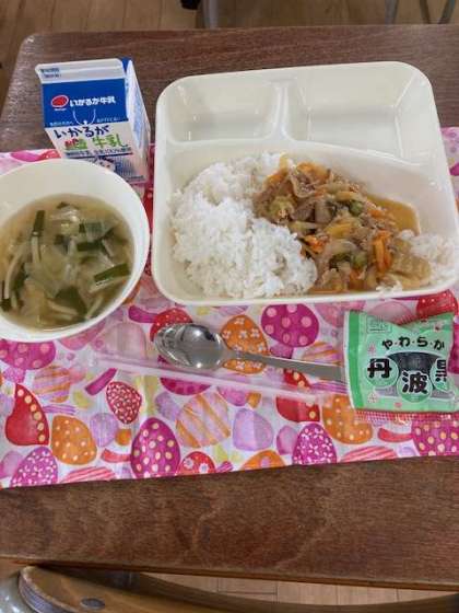 今日の献立は、ピリ辛丼・牛乳・中華スープ・ソフト黒豆です。