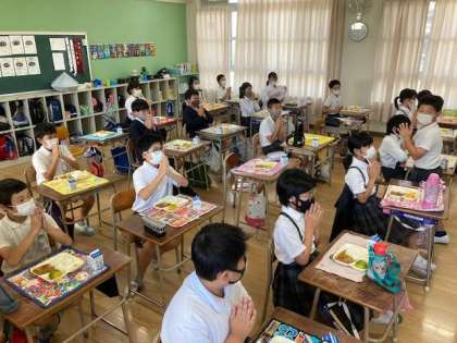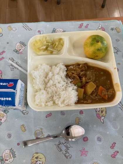 今日の献立は、ポークカレーライス・牛乳・キャベツのピクルス・みかんです。