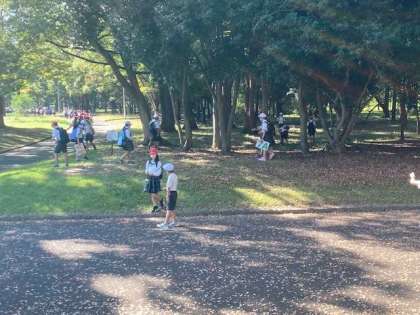 出発前、5年生と6年生がお弁当を食べた場所を中心に公園のゴミ拾いをしました。