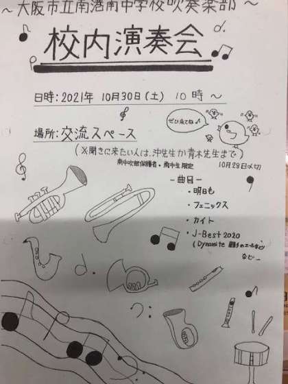 10/30(土)に本校、交流スペースで吹奏楽部の校内演奏会が行われました。アンコールも含め計10曲、大盛況の中、素晴らしい演奏をしてくれました。まさに「芸術の秋!」でした。