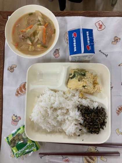 今日の献立は、ご飯、牛乳、千種焼き、みそ汁、ごまひじき、抹茶大豆です。