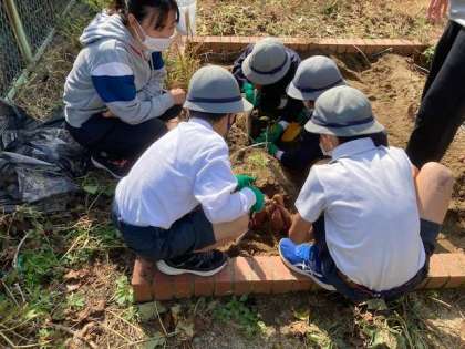 すまいる学級学習園でお芋堀りを行いました。暖かい気候の中、スコップを使って、お芋を途中で切ってしまわぬ様、細心の注意を払いながら、楽しみました。