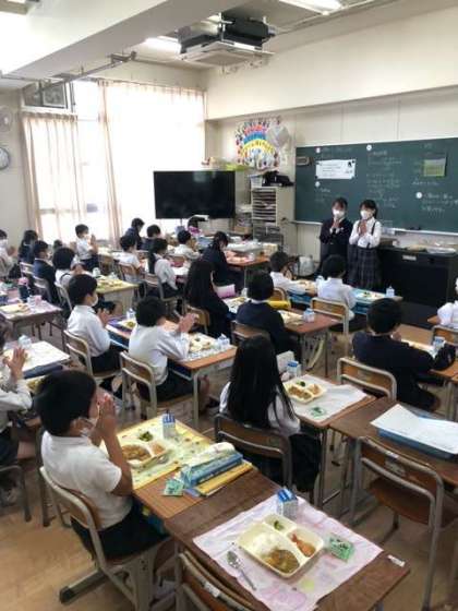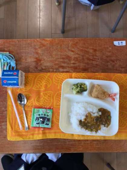 本日のメニューは、えびカレーライス・ブロッコリーのサラダ・ソフト黒豆・牛乳でした。