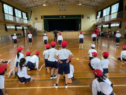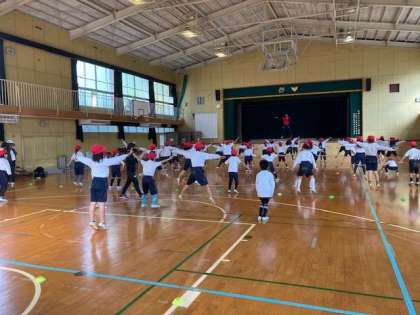 残念ながら、明朝の雨で運動場が使えなくなり、体育館での開催となりました。