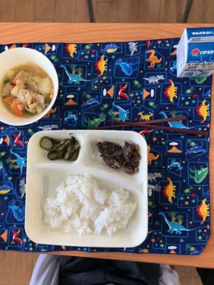 今日の給食のメニューは、ごはん・牛乳・くじらのたつたあげ・豚肉とじゃがいもの煮もの・きゅうりの赤じそあえでした。