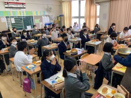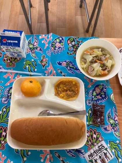 今日の献立は、コッペパン、牛乳、豚肉と野菜のスープ煮、変わりピザです。