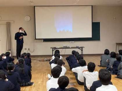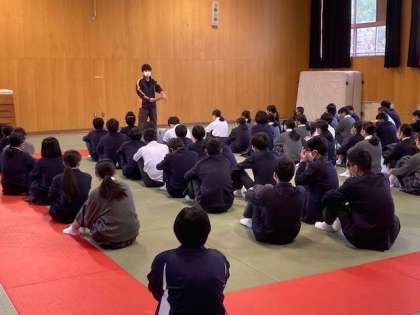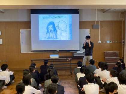 7年生は教員の趣味の話から、生徒の興味関心を高めていました。
