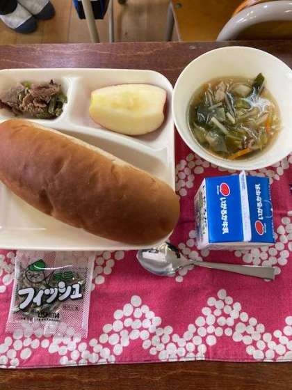 今日の献立は、こくとうパン、牛乳、牛肉のオイスターソース焼き、中華スープ、りんごです。
