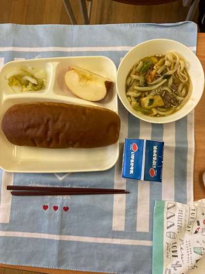 今日の献立は、こくとうパン、牛乳、カレーうどん・はくさいの甘酢あえ、りんごです。