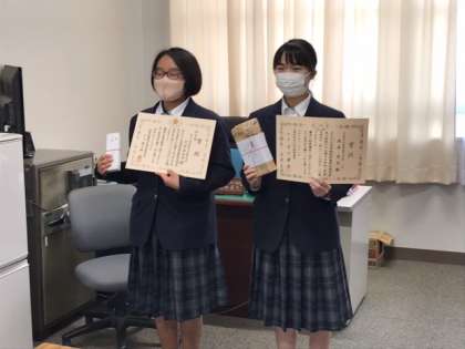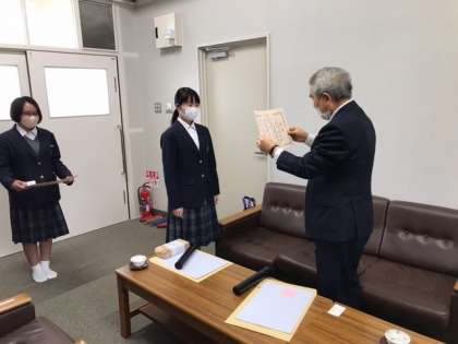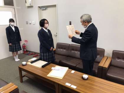 全国納税貯蓄組合および国税庁主催の「税の作文コンクール」にて優秀であった生徒に住吉納税貯蓄組合会長から表彰状を授与していただきました。