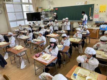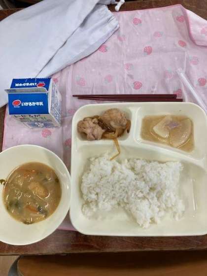 今日の献立は、ご飯、牛乳、鶏肉の甘辛焼き、田辺だいこん葉種葉のみそ汁、田辺だいこんの煮物です。