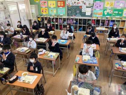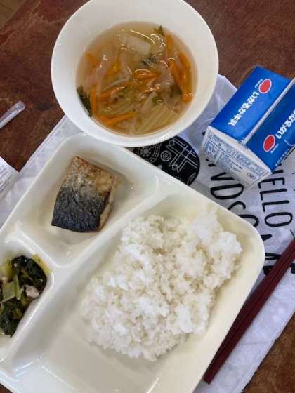 今日の献立は、ご飯、牛乳、さばのみぞれかけ、すまし汁、こまつなの煮びたしです。