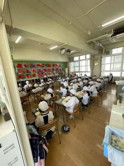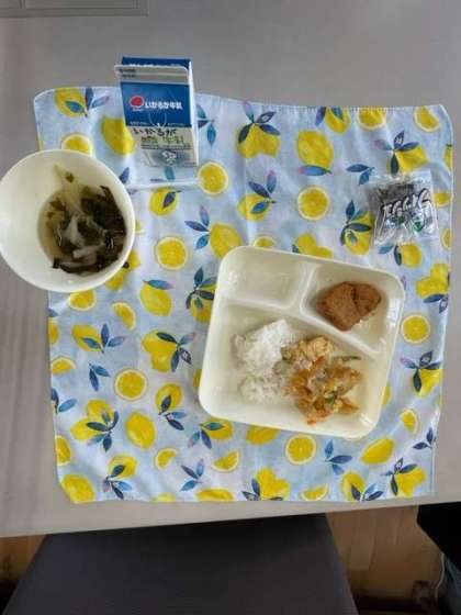 本日の給食のメニューは、牛乳・カツ丼・すまし汁・ミニフィッシュです。