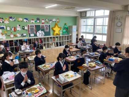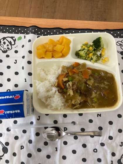 今日の献立は、冬野菜のカレーライス、牛乳、ブロッコリーとコーンのサラダ、黄桃です