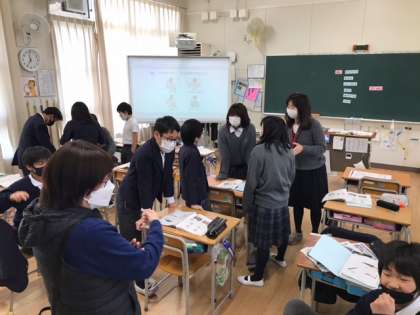 6年2組は、英語の授業です。中学校の英語科の先生も指導しています。