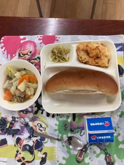 今日の献立は、黒糖パン、牛乳、ポトフ、カレーソテー、桃のクラフティです。