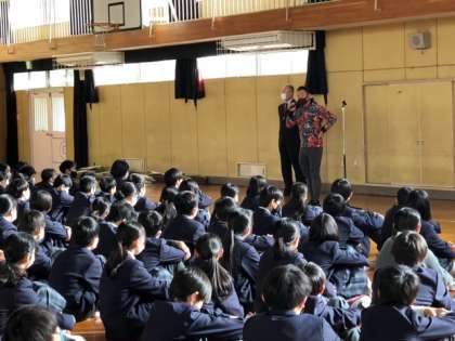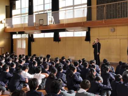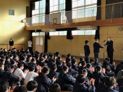 今朝、中学生3学年そろっての最後の中学校集会がありました。サッカー部の表彰に続き、校長先生からは「優しい言葉が出るときには、美味しいものを食べたときと同じように表情が優しくなる。集団になって良くない言葉を出すのではなく、良い言葉がけをできる人になって欲しい。」というお話。また、生活指導の先生からは、南中の良さ「当たり前のことを当たり前にできる」をさらに伸ばせるよう、挨拶や身なりをより一層しっかりできるようにしていこうというお話がありました。