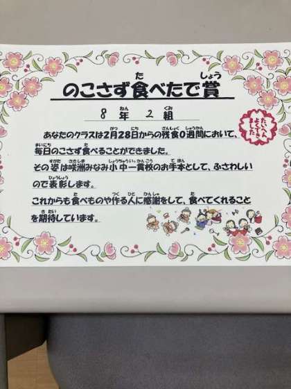 2月末から行われていた「3月残食0週間」の達成クラスの表彰がありました。