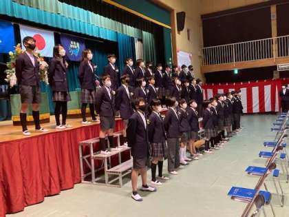 続いて卒業生が呼びかけ「無限大の未来へ」を行いました。その中で歌われる「太陽・四つ葉・しずく、無限大∞」は作詞が卒業生、作曲が中学校音楽科の先生という世界に一つだけのオリジナルソングです。