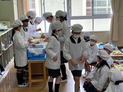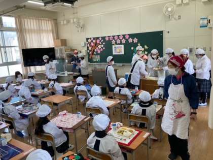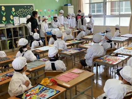 1年生の給食は、6年生が配膳などの準備をしてくれます。