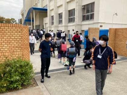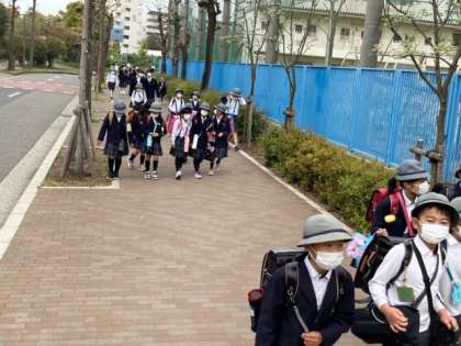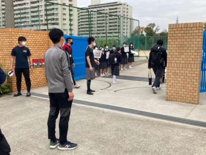 今朝の通用門では、部活動の先輩たちが新入部員募集の呼びかけをしました。