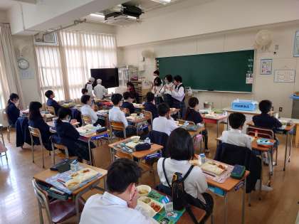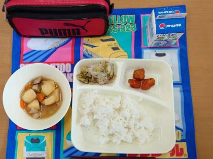 まぐろのオーロラ煮と豚肉と野菜の煮もの、キャベツの赤じそあえです。