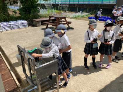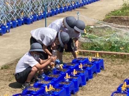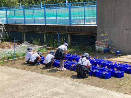 毎日、1年生はそれぞれが育てているお花に水をあげにいきます。