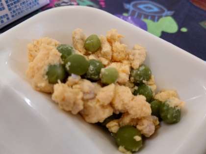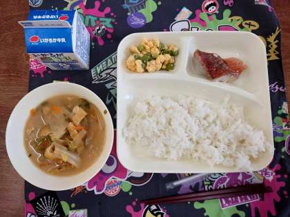 献立は、あかうおのしょうゆだれかけ、みそ汁、えんどうの卵とじです。