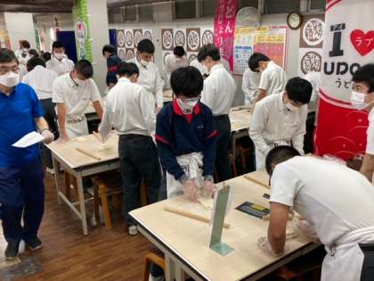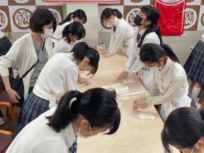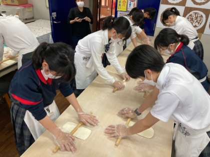 生地を麺棒でのばしますが、なかなかむずかしいようです。