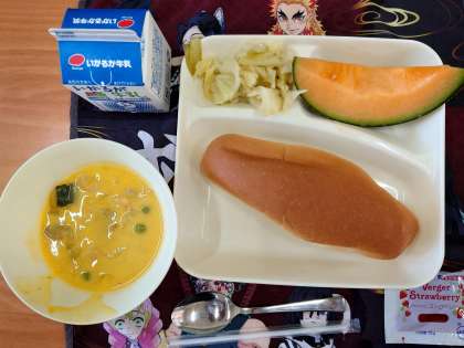献立は、かぼちゃのクリームシチュー、キャベツのゆずドレッシング、クインシーメロンです。