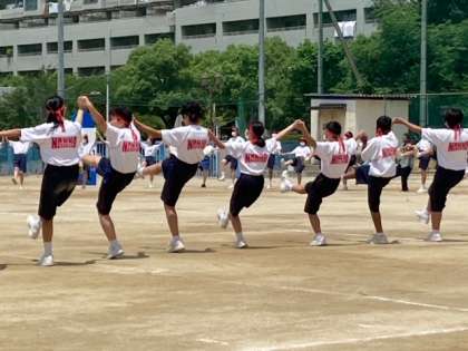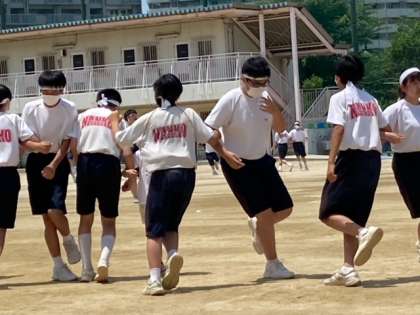 マイムマイムに合わせてオリジナルのフォークダンスです。9年生は先週の修学旅行でも練習しました。