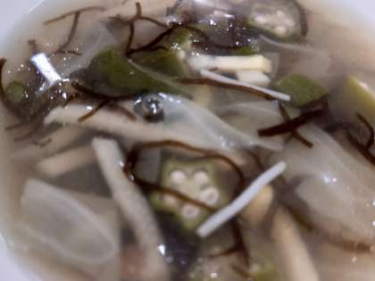 献立は、豚肉の甘辛焼き、もずくとオクラのとろり汁、切り干しだいこんのいため煮です。