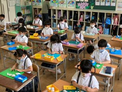 1組はおんがく、2組は図工で粘土細工です。