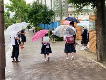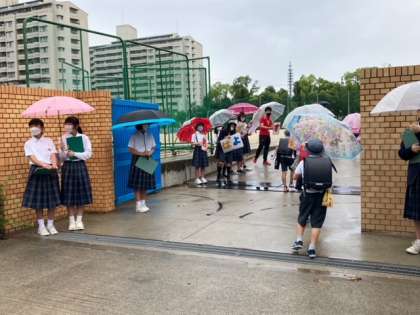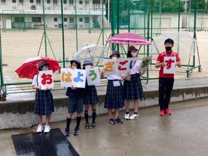 梅雨入りのため小雨もようですが、今週は児童会の委員があいさつ運動を行なってくれています。