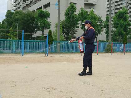 加えて、消防署の方には、消化器の使い方も教えていただきました。